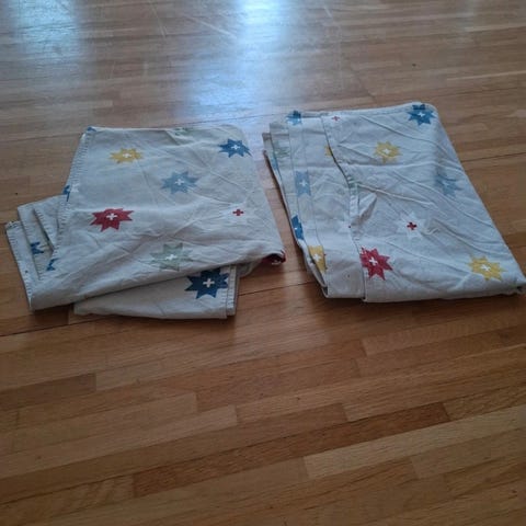 Säljer 2st röda öljettgardiner i storleken 2,05 x 1,45 m. Köpta på Jotex.