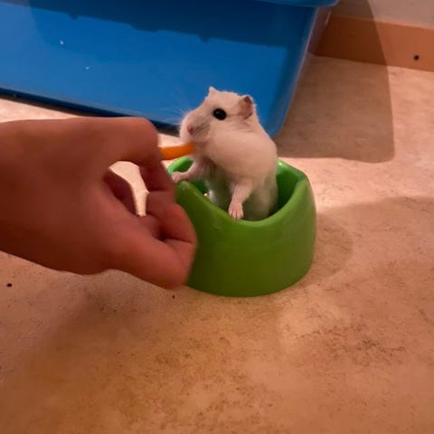 Lilla Greta, vår renrasiga vintervita dvärghamster hona på 5 veckor, letar nu efter nytt hem. Hon älskar att äta äpple och att krypa upp i handen.