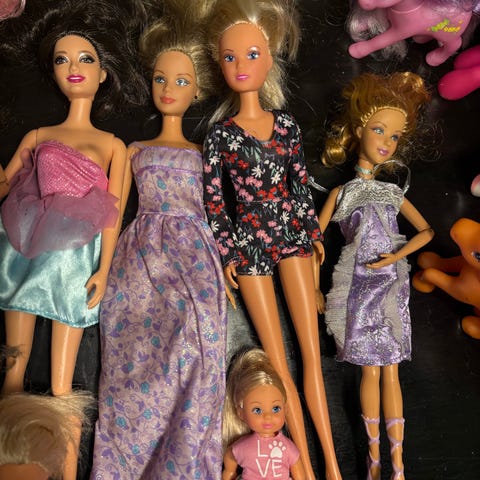 Barbie dockor och kläder set med flera dockor i olika storlekar och kläder i olika färger, inklusive rosa och blått. Setet innehåller även accessoarer och klädesplagg för variation i lek. Innehåller en häst, Elsa, ballerina, säng med flera.
