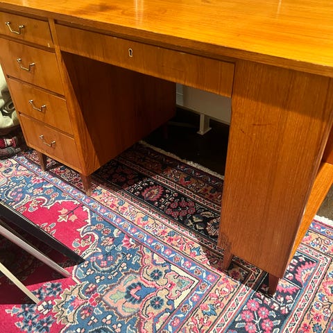 Äldre litet skrivbord, antagligen ek, säljs i fint skick. Den har lite skav men påverkar inte användandet.