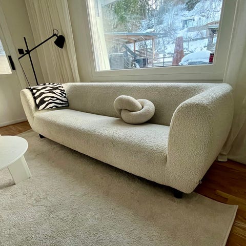 3-sitssoffa med modern, organisk form. Stomme i massiv furu och plywood. Ben i bokträ. Klädsel i mjuk fårpälsimitation av polyester. Klädseln är ej avtagbar. Skumfyllning och nozagfjädrar. Frihöjd under möbel 17 cm. Monterad.