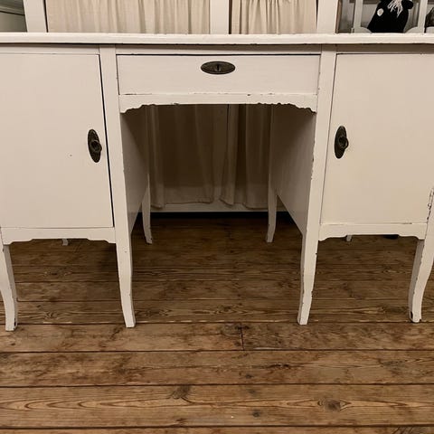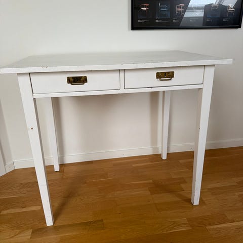 Säljer ett äldre skrivbord/arbetsbänk med hurts i bra skick. Brun solid skiva med underrede och ben i stål.