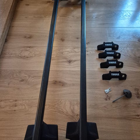 Takräcken från Thule av i Squarebar utförande, dvs rak profil utan T-spår. Verkar vara fullt fungerande, har dock ingen nyckel till ändbitarna.