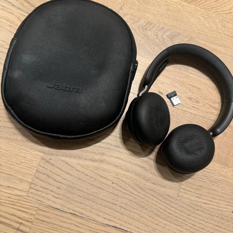 Jabra hörlurar med medföljande fodral. Hörlurarna är svarta och har en över örat-design. Produkten är avsedd för allmänt bruk.