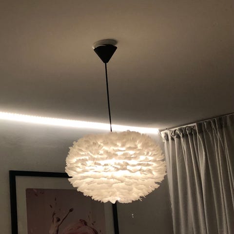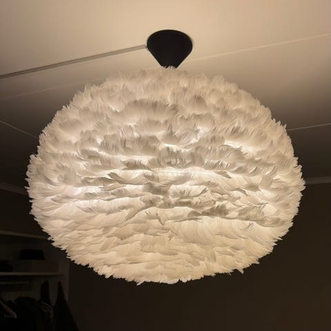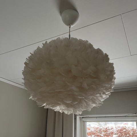 Två fina taklampor med vita fjädrar.