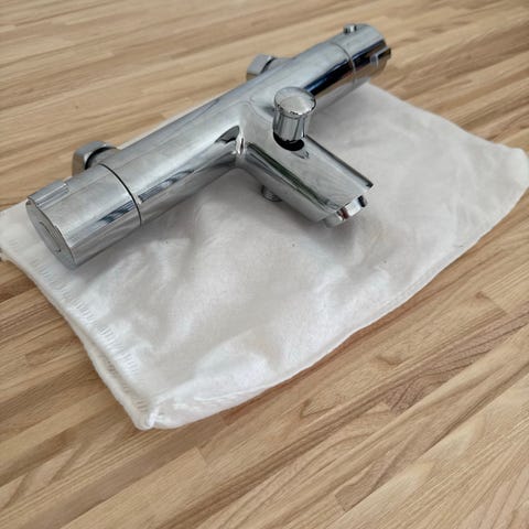 Badkarsblandare i mässing med två vred för varm och kall vattenkontroll samt duschhandtag med slang. Passar för badkar.