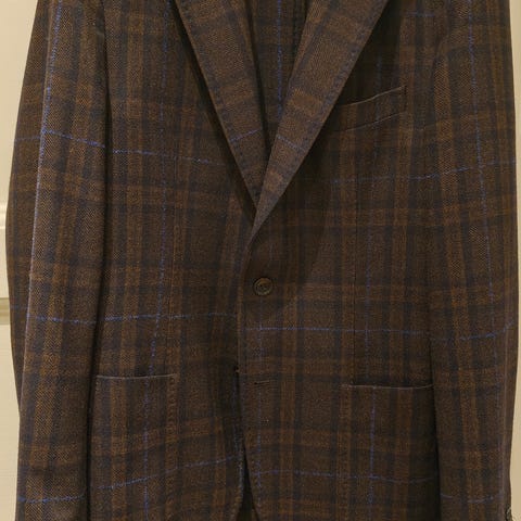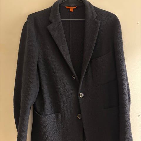 Mauro Blasi Napoli. Helt handgjord och helt fantastisk kavaj i fin blå färg. Använd ett antal gånger men fortfarande i väldigt fint skick. Originalgalge medföljer. 67% Ull / 20% Silke / 13% Linne. Storlek 48.