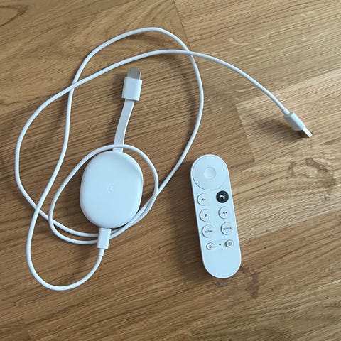 Google Chromecast streaming-enhet med medföljande strömadapter och USB-kabel. Enheten används för att strömma innehåll från mobila enheter eller datorer till TV-skärmar.