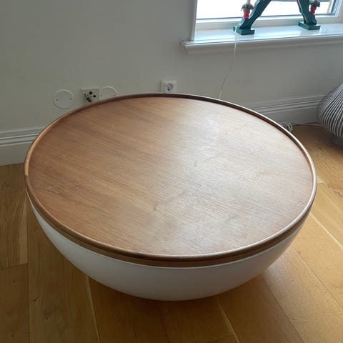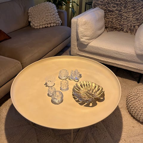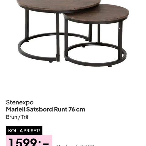 Runt soffbord i pulverlackerad metall med matt yta. Det finessrika soffbordet är ett stort brickbord som dessutom är hopfällbart, praktiskt på många sätt. Bordsskivorna har en liten kant runtom. Stommen har fyrkantig, massiv järnprofil och kan fällas ihop vid förvaring.