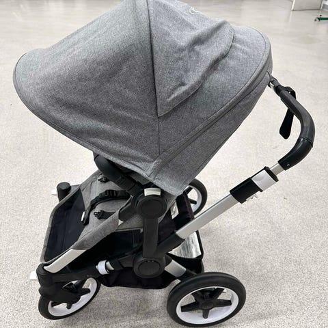 Bugaboo barnvagn i grått. Den har fyra hjul och en sufflett för att skydda den från väder och vind. Den är utrustad med två barnstolarna med säkerhetssele, ett körhandta, och en sidoväska. Lämplig för barn och designad för utomhusbruk. Den har endast använts av ett barn och är i mycket gott skick.