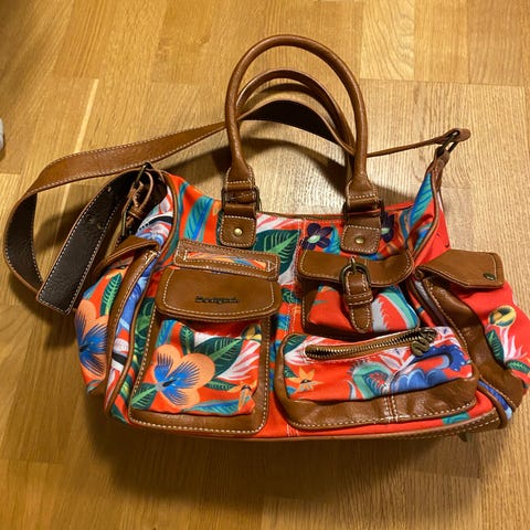 Desigual tygväska för kvinna med flerfärgat mönster och detaljer i brunt material. Väskan har handtag och flera fack, inklusive ett med dragkedja på framsidan. Invändigt fodrad med mönstrat tyg.