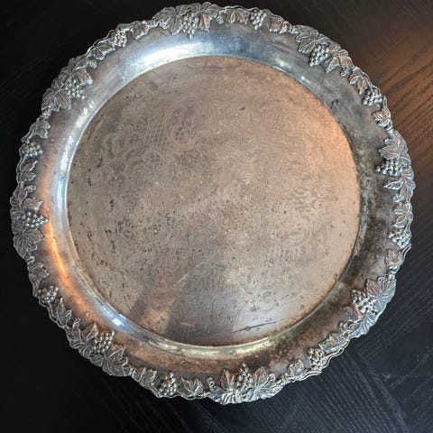 Signerad, handmålad stor serveringsbricka i metall. Mått ca 40x60 cm. Gott skick, det mesta slitaget är på undersidan medan motivet är välbevarat.
