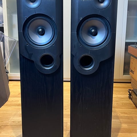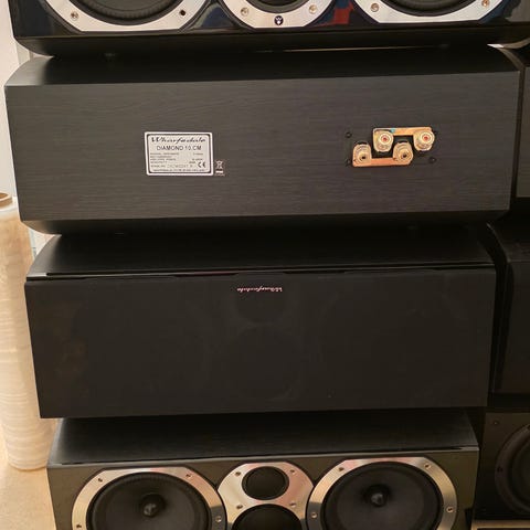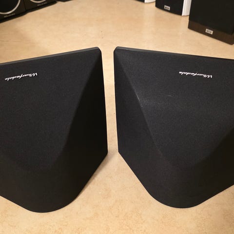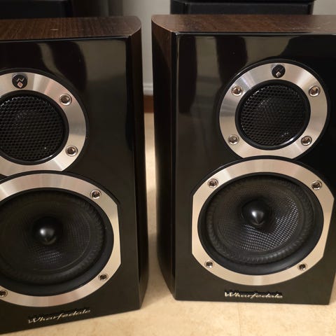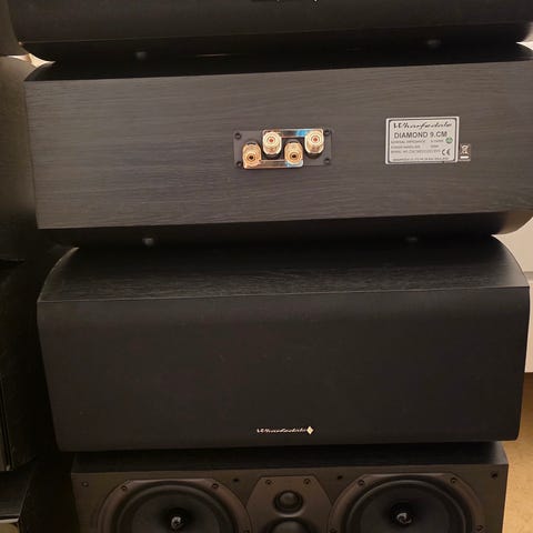 Wharfedale Diamond 9.SR högtalare med träutförande. Högtalarna har en traditionell design med två högtalarelement per enhet och anslutningar på baksidan. Passar för användning i hemmaljudsystem.