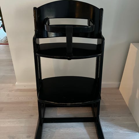 Justerbar stol designad för barn med fotstöd och säkerhetsfunktioner.