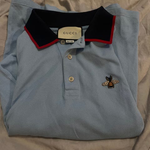 Gucci Polo i vitt, tillverkad av bomull. Herrstorlek L. Polon har en krage med blå och röda detaljer samt ränder med text på ärmarna. Bra skick. Ny pris 7500-8500 mitt pris 4000 kan diskuteras i meddelanden