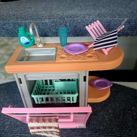 Barbie lekkök för barn i rosa färg med spis, ugn, diskho och förvaringsutrymme. Leksaken är utformad för barn och har detaljer som efterliknar ett riktigt kök.Och baksidan på den,har en trä hylla för dockor..