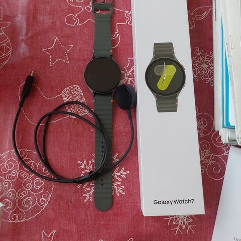 Samsung Galaxy Watch 5 smartklocka med beige/ros armband. Utrustad med rund skärm och sensorer på baksidan för hälsomätningar. Levereras med laddningskabel. Finns inte kvitto eller kartong kvar. 40mm boett.