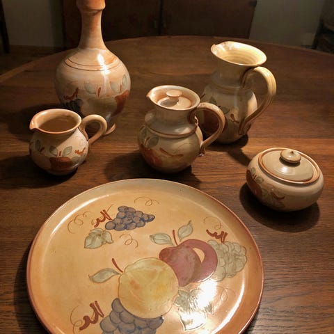 Köksporslin set bestående av små skålar, soppskålar, fat, stora salladsskålaroc en liten kanna. Servisen är beige och rustik. Ginns centralt i stockholm