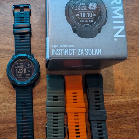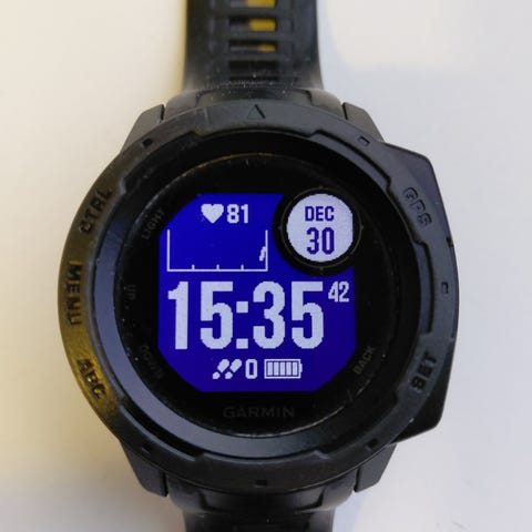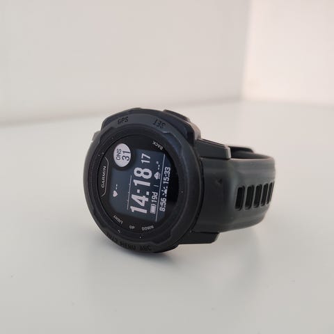 Smartklocka med svart armband och rund urtavla. Klockan har en robust design och är utrustad för olika utomhusaktiviteter. Armbandet är tillverkat av hållbart material och klockan har sensorer för pulsmätning och GPS.