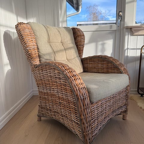 Loungestol i konstrottning köpt på Jysk för 4699kr. Steglös justering av stolsrygg och benstöd. Dyna ingår. Bredd 66, höjd 102, djup 72. Kan användas inomhus och utomhus. Lite intryckt i sidan, men fungerar. Hämtas i Svarte.