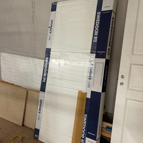 Swedoor – Trädörr med Fyrkantiga Glasfönster – ny inkl. Låskista