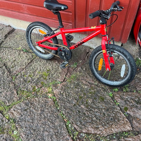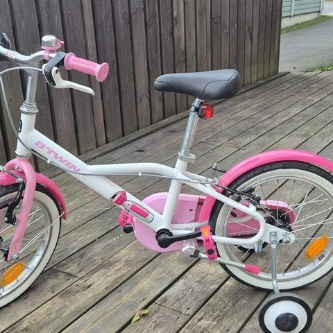 Logan barncykel i blå färg med stödhjul. Cykeln har en ram och däck anpassade för barn. Som ny