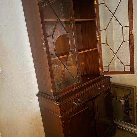 Bredd bakkant 98 cm. Bredd framkant 72 cm. Mörkt trä. Två glashyllor.