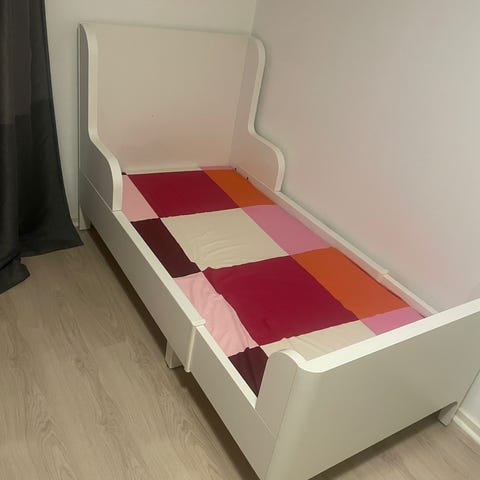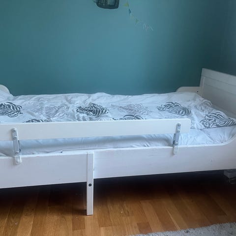 Vi säljer en barnsäng med utdragbar sängstomme inkl ribbotten samt madrassen ”INNERLIG” som är en bekväm resårmadrass (130 cm + 35 cm + 35 cm).