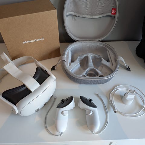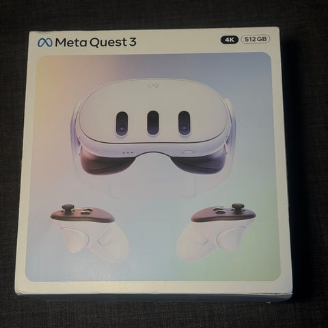 Sparsamt använd Meta Quest 3 med 128 GB lagringsminne, obs ska ej förväxlas med 3s. Pro huvudband från Bobo VR ingår med extra batteri för förlängd speltid, samt bärväska från samma märke. Orginalförpackning går också att få med.