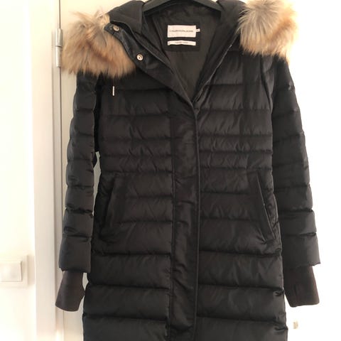 Svart vadderad jacka med huva från Calvin Klein, L, jacka +foder 100% polyester, fjäderfyllning. Jackan har dragkedja fram, 2 framfickor med dragkedja, 2 innerfickor, fleecefodrad, justerbar huva. Längd mitt bak ca 68 cm, bredd över ryggen ca 58 cm.