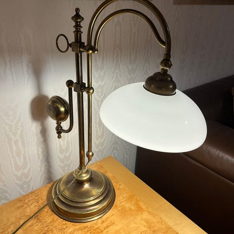 Bordslampor i mässing med en vit lampskärm. Lamporna har en böjd arm och en cirkulär bas. Dem är försedd med en sladd för anslutning till elnätet. Passar för användning som läslampa, eller allmän belysning på bord eller skrivbord.
