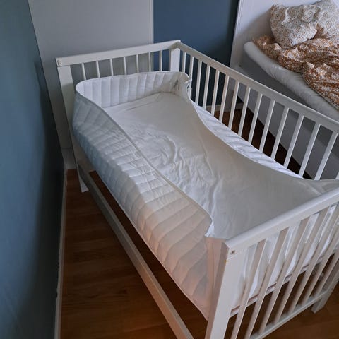 IKEA Spjälsäng i grå färg. Tillverkad i trämaterial. Passar för barn och är utformad för att ge en säker sovplats för spädbarn och småbarn.
