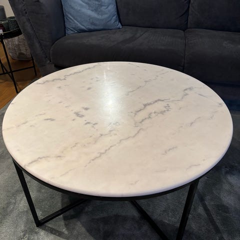 Använt skick, syns märken från användning efter vattenglas etc om man kollar från sidan i ljuset på själva marmorskivan. Finns även ett litet märke på ena sidan men är knappt synligt.