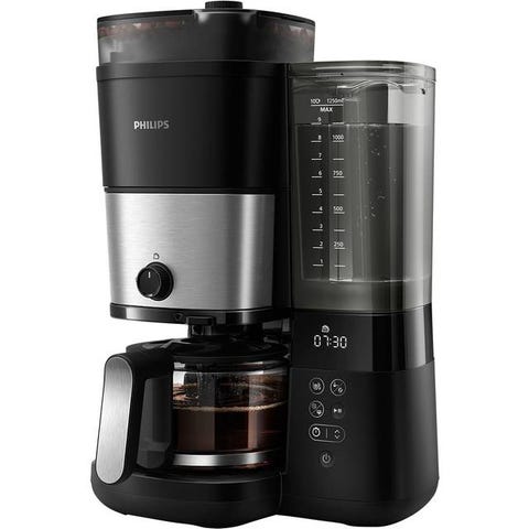 Princess kaffebryggare med inbyggd kaffekvarn. Maskinen har en digital display och en glaskanna för bryggning av kaffe. Designad för att mala bönor och brygga kaffe i ett steg. Men finns även för malda bönor då alla stönger av malen.