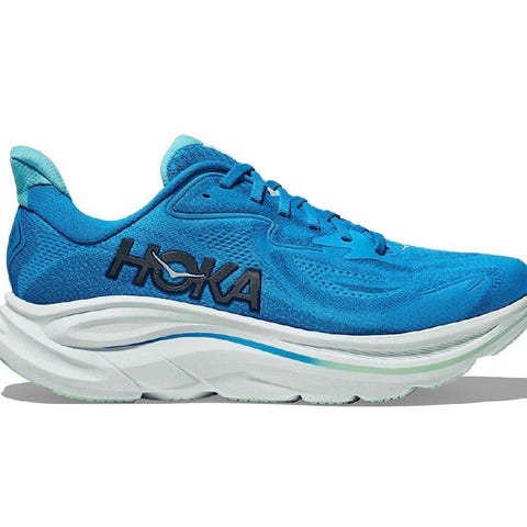 Hoka löparskor i blå färg, storlek 43. Skorna är designade för löpning och har egenskaper som stödjer denna sport.