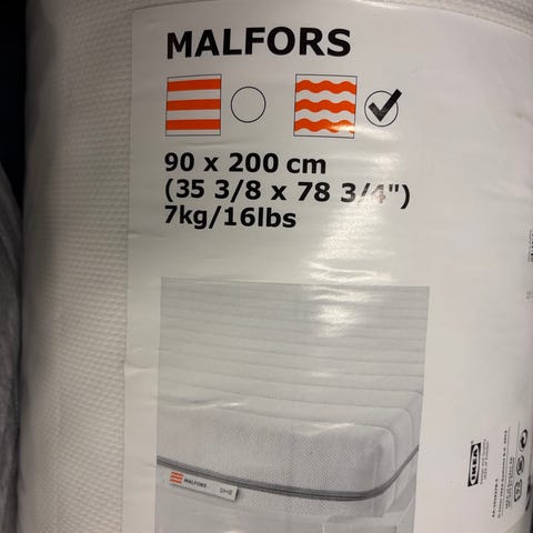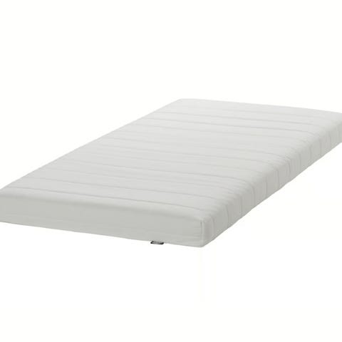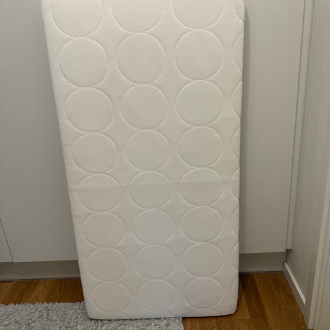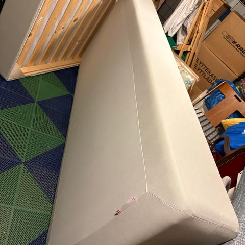 Madrassen är ny och oanvänd, men vi har klippt den itu som man ser på bilden. Fodralet håller dock ihop de båda delarna mycket väl och det märks inte om man ligger på den.