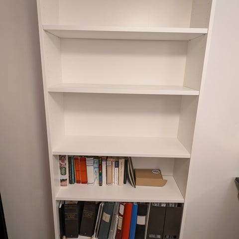 Säljer en bokhylla Billy mått enligt första bilden. Den är med påbyggnad på höjden som går att ta av den innehåller 3 lampor från Ikea som drivs på batteri. Dem är bara att ta bort vid behov sitter i en liten skruv.