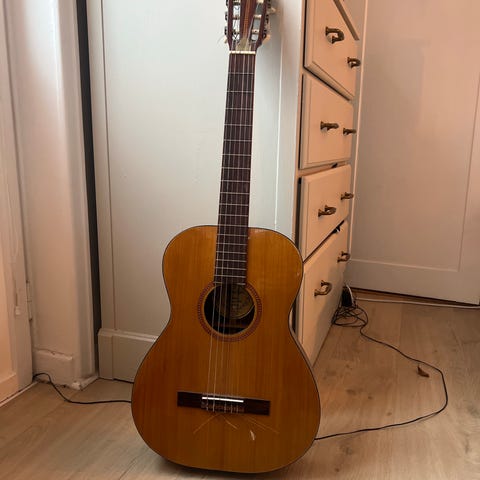 Akustisk gitarr i trä med klassisk design. Byggd på 80-talet. Funkar fint.