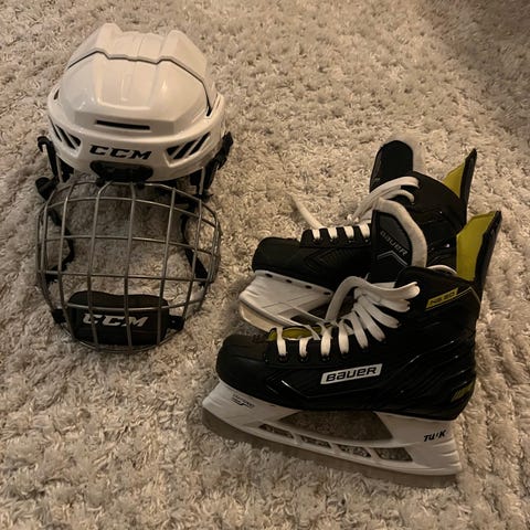 Skriskor använda en säsong storlek 31. Hjälm storlek 51-55.5 cm lite skada på hakskyddet (går att köpa nytt och montera dit om man vill)