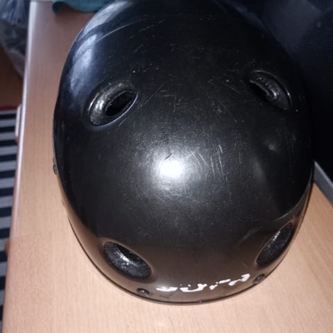 Hjälmen har ventilationshål och är designad för att ge skydd vid cykling eller andra aktiviteter där huvudskydd behövs.