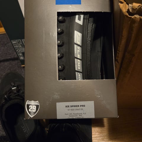 Två nya dubbdäck av märket XLC SpikeX. 120 aluminiumdubb per däck. Storlek 28x1,6 (tum) vilket motsvarar 42-622 (mm) eller 700X40C (fransk).