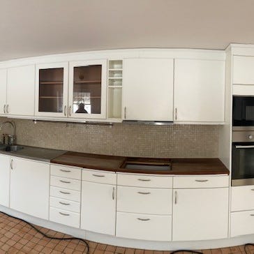 Öppnas uppåt, det finns en glas hylla i varje skåp . Belysning i vitrinskåpen och under skåpen . BILD 4 Vasken är fabriks limmad i bänkskivan . Det finns fuktskador på stommarna till höger och vänster om diskmaskinen och på två lådfronter .BILD 5 Vit tålig Bänkskiva i laminat med aluminium kant . Bänkskivan är totalt 400 cm lång . Ca 322,5 cm är den 70 cm bred resterande längd är den 88 cm bred .Spishällen ingår om man vill ha den ,fungerar men en platta krånglar ibland . Nedmonteras efter överenskommelse.