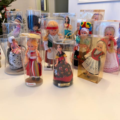 En samling dockor i olika storlekar och utföranden, inklusive dockor i traditionella kläder från olika kulturer. Vissa dockor är förpackade i plastbehållare eller kartonger. Material och exakta mått varierar mellan dockorna. Många är från landskap i Sverige och många från Danmark sedan finns det lite blandat från Europa