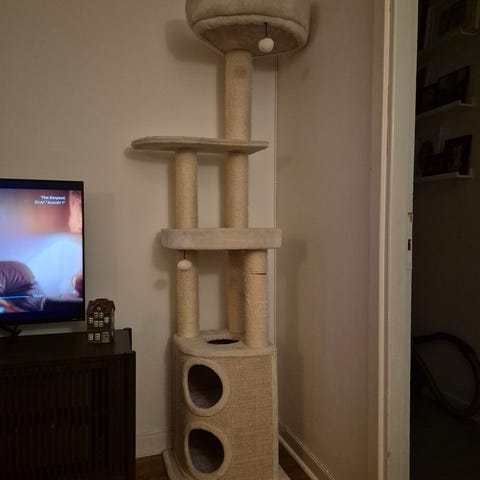 Ebi Klösträd för katt i beige färg. Tillverkad med material som är lämpliga för klösning och lek. Har flera öppningar och en mjuk yta för vila. Passar för inomhusbruk.
