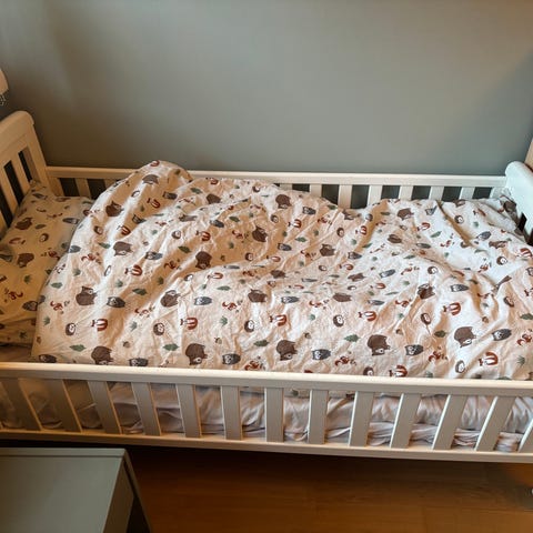 Vit hus-säng för barn, inklusive madrass. se första bilden för mått. Köpt på amazon för inte ens ett år sedan, passar tyvärr inte in i det nya sovrummet. Därav är taket inte ditsatt på bilderna men medföljer såklart. Madrassen är köpt på Jysk, även den för mindre än ett år sedan. Finns nedmonterad så är enkelt att hämta, endast madrassen som tar plats. Prioriterar snabb hämtning