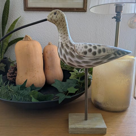 Handgjord träskulptur föreställande en fågel med lång hals och näbb. Tillverkad av trä med en naturlig träfärgad och mörkare ton. Passar som dekorativt föremål i hemmet.