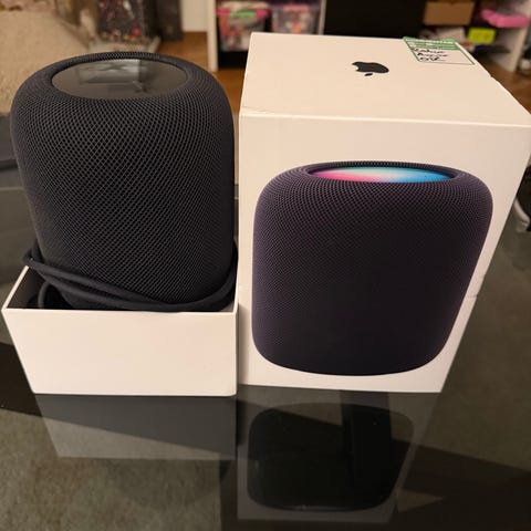 Apple HomePod mini smart högtalare i svart färg. Kompakt design med mesh-tyg runtom. Används för trådlös ljuduppspelning och röststyrning via Siri. Passar för hemmabruk och ansluts via strömkabel.