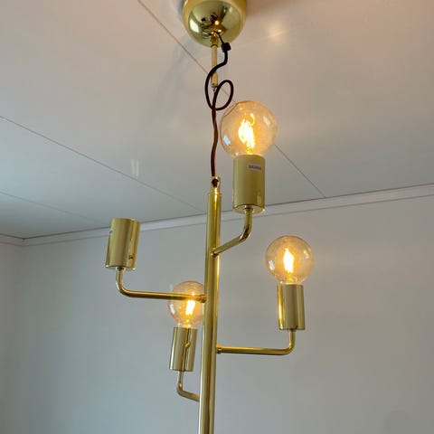 Vacker hängande lampa i mässing med opalvit glaskupa.