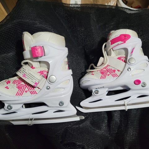 Barnskridskor i storlek 26, grå färg. Utrustade med justerbara spännen.