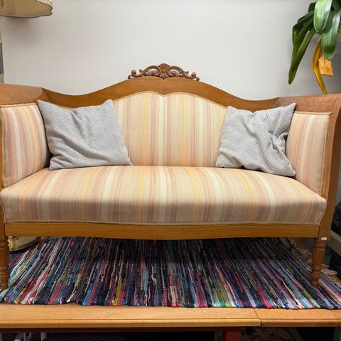 Införskaffad från auktionshus Kolonn i höstas för 3000 kr (värderad 3000 kr) i mycket bra skick. Nu har vi fått katt och två revor finns se på bild. Vi säljer vidare innan den vackra soffan slits mer.